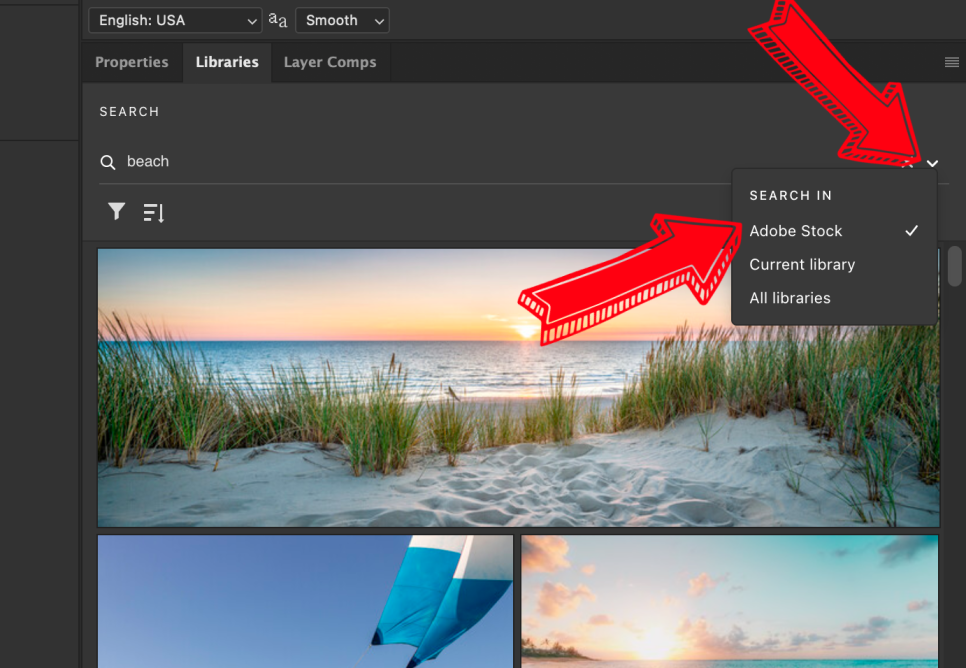 1. 라이브러리 패널을 실행후, 검색창 우측에 있는 ⋁ 버튼을 선택해서 'Adobe Stock'을 선택합니다.