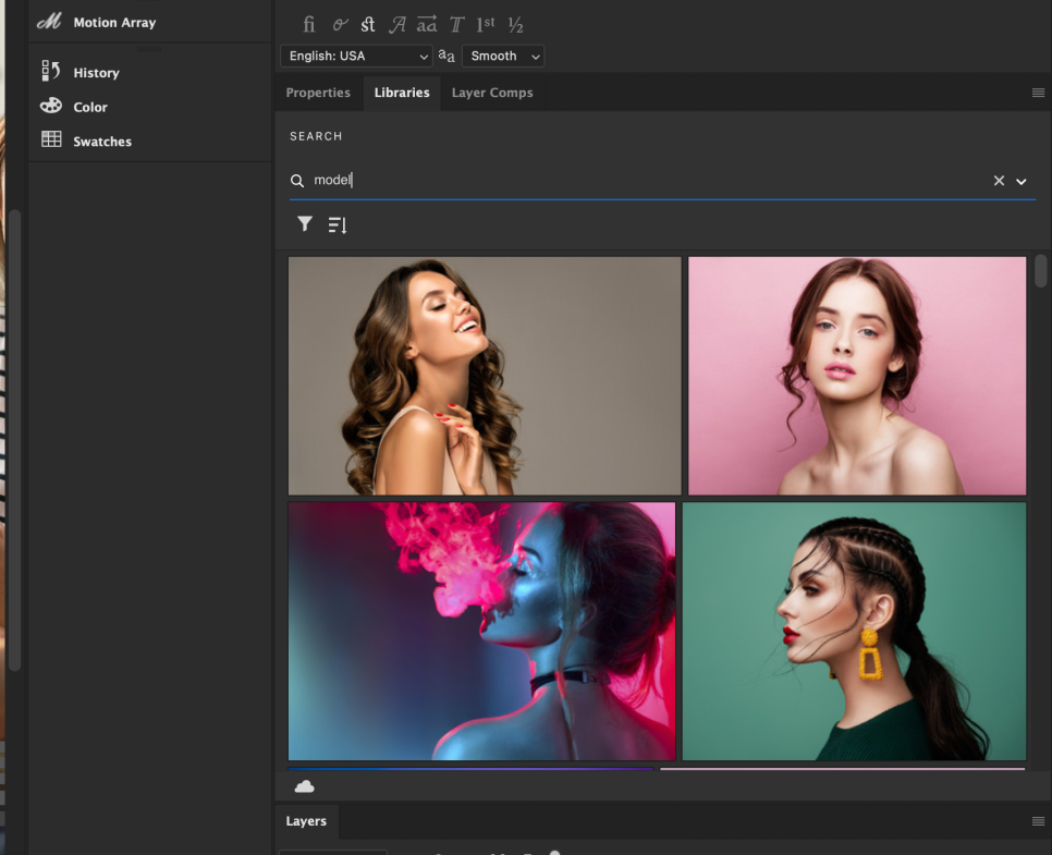 2. 라이브러리 검색창이 'model'이라고 검색하면 아래 이미지처럼 어도비 스톡 이미지가 바로 검색됩니다.