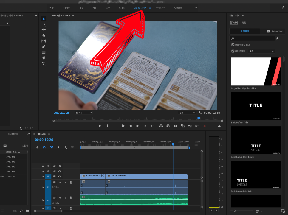 1. 먼저 상단 메뉴에서 프리미어 작업영역을 '캡션 및 그래픽'으로 변경합니다. (빨간 화살표 표시)