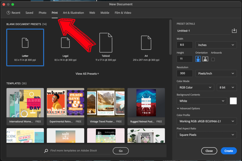 1. 포토샵 실행 후 새문서(New Document)를 선택하면 아래와 같은 팝업창이 뜨는데, 여기에서 상단에 있는 Photo, Print, Art & illustration, Web, Mobile, Film & Video 중 원하는 항목을 선택합니다. (빨간 화살표 표시)