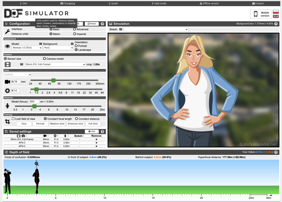 그래서 렌즈 초점거리, 조리개 값, 피사체와 거리, 그리고 렌즈를 미리 선택해서 확인해 볼수 있어요.
